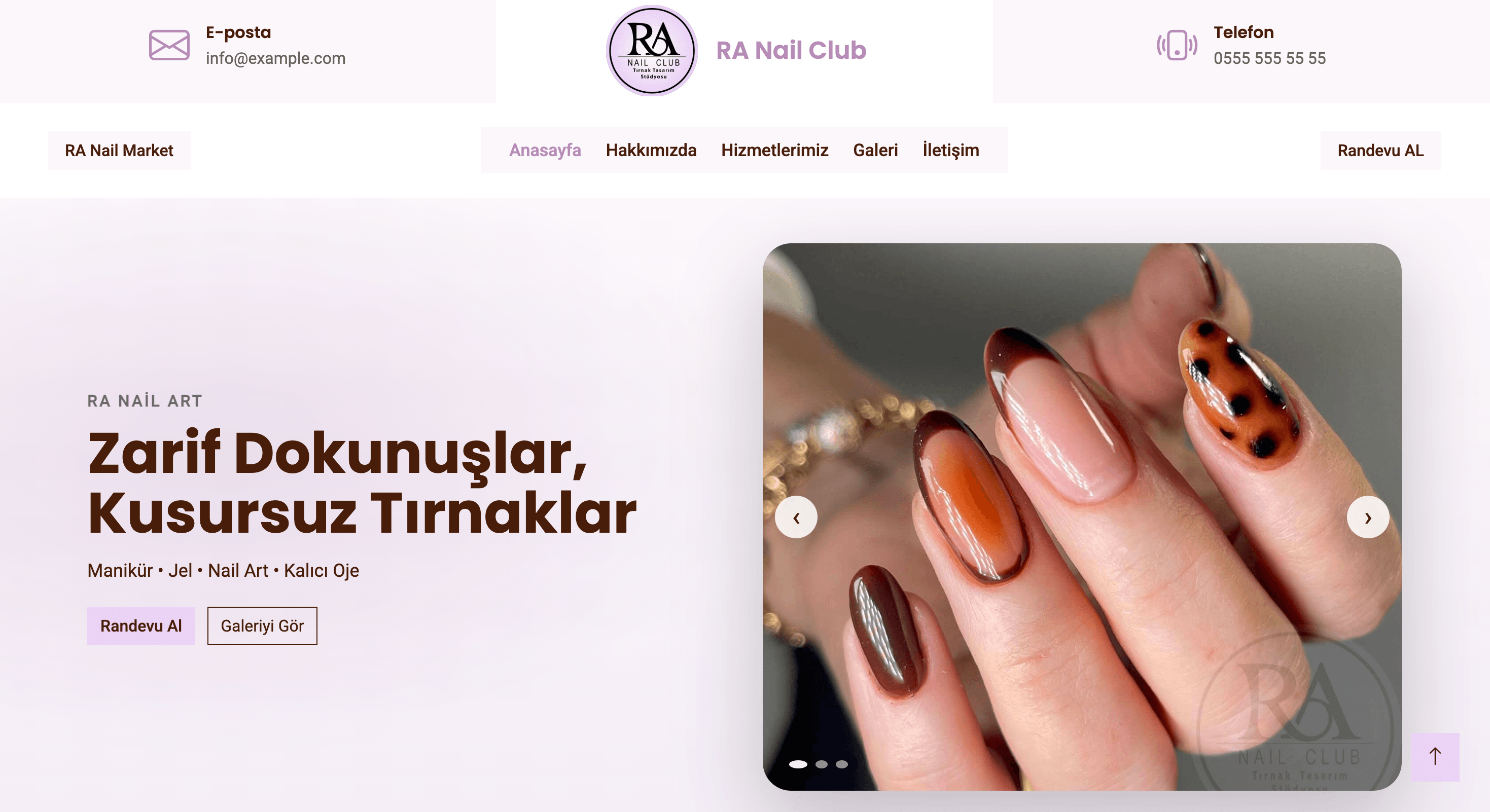 RA Nail Art projesi kapsamında, modern ve kullanıcı dostu bir arayüze sahip profesyonel bir web sitesi tasarlayıp geliştirdim. Projede, hizmetlerin etkili şekilde sunulması, randevu deneyiminin kolaylaştırılması ve marka kimliğinin güçlü bir şekilde yansıtılması üzerine odaklandım. Frontend ve backend süreçlerini entegre ederek, estetik ve işlevselliği bir araya getiren kapsamlı bir dijital çözüm oluşturdum. Proje Linki.